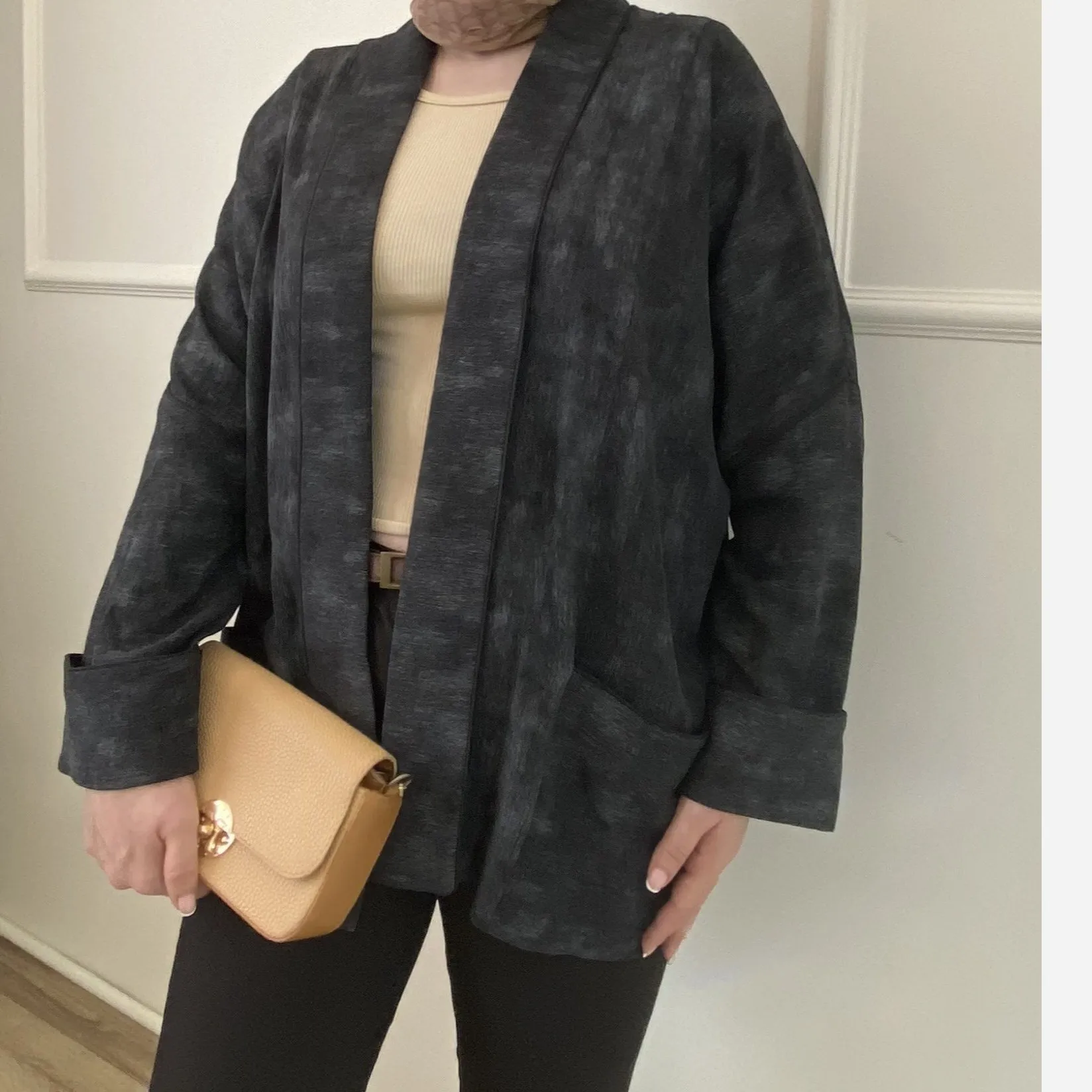مانتو زنانه شیک یقه برگردان مدل کیمانو جلو باز طرح ابر و بادی جنس شانتون فری سایز