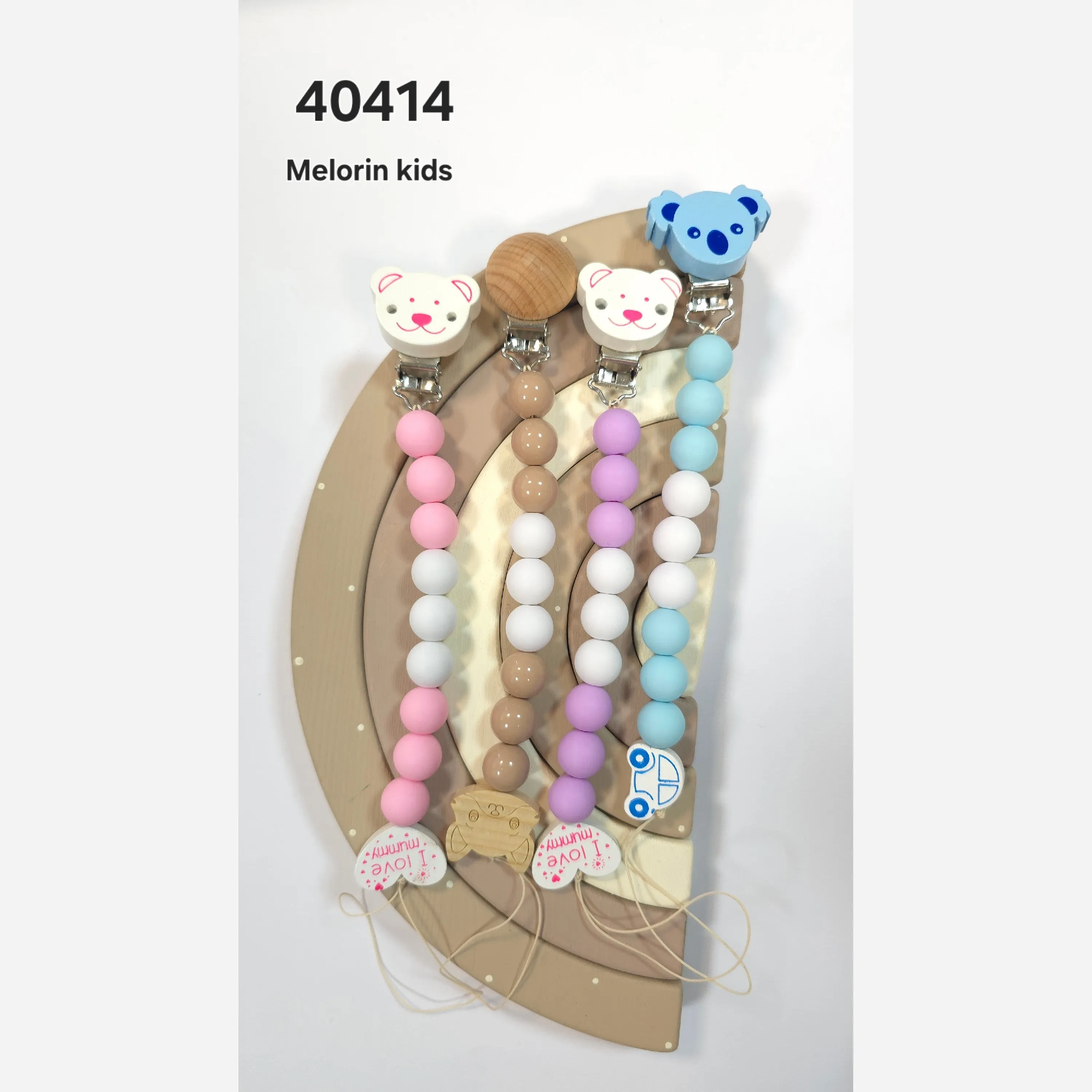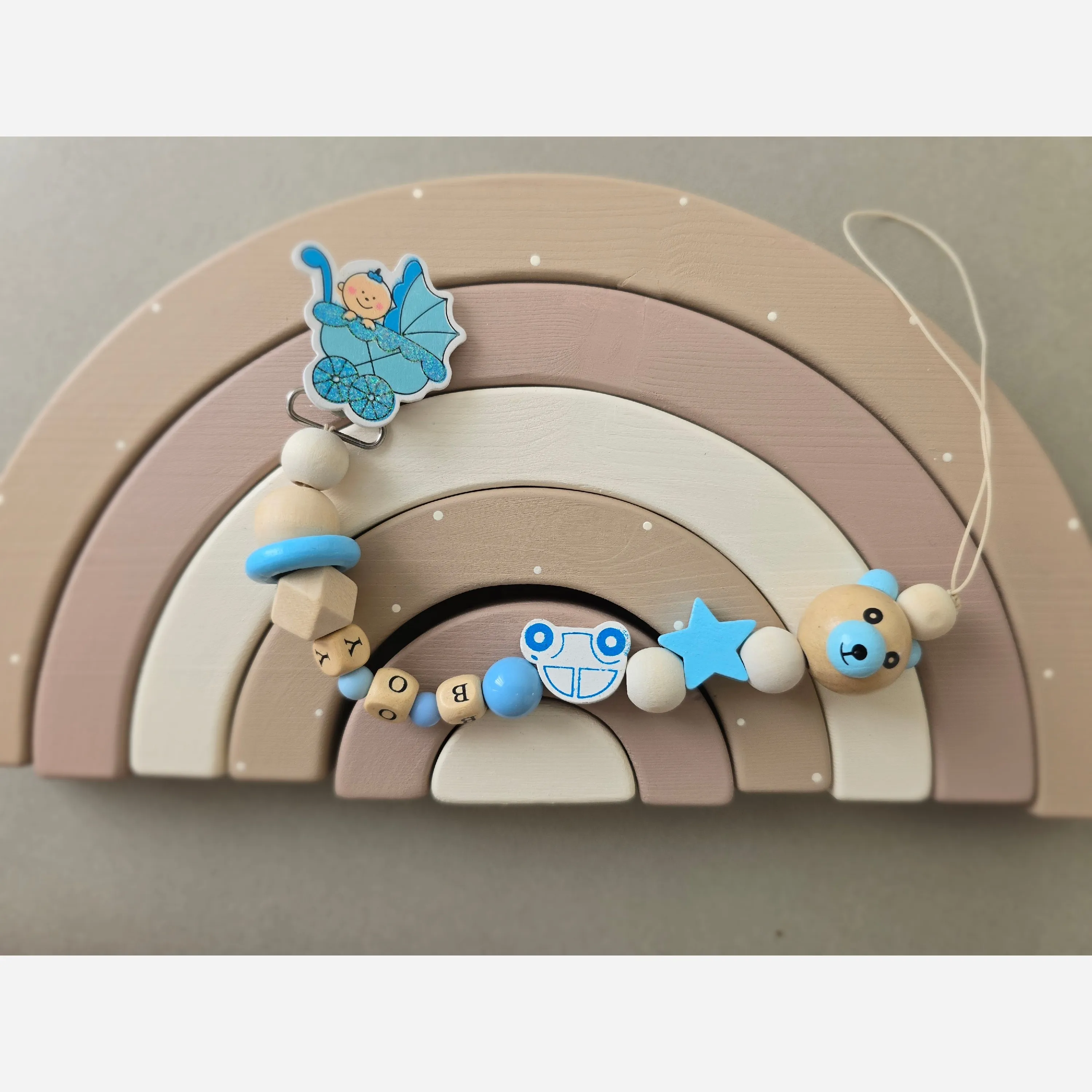 گیره پستونک چوبی و سیلیکونی طرح رنگین کمان و خرس برای نوزادان | بند آویز دندانگیر کودک