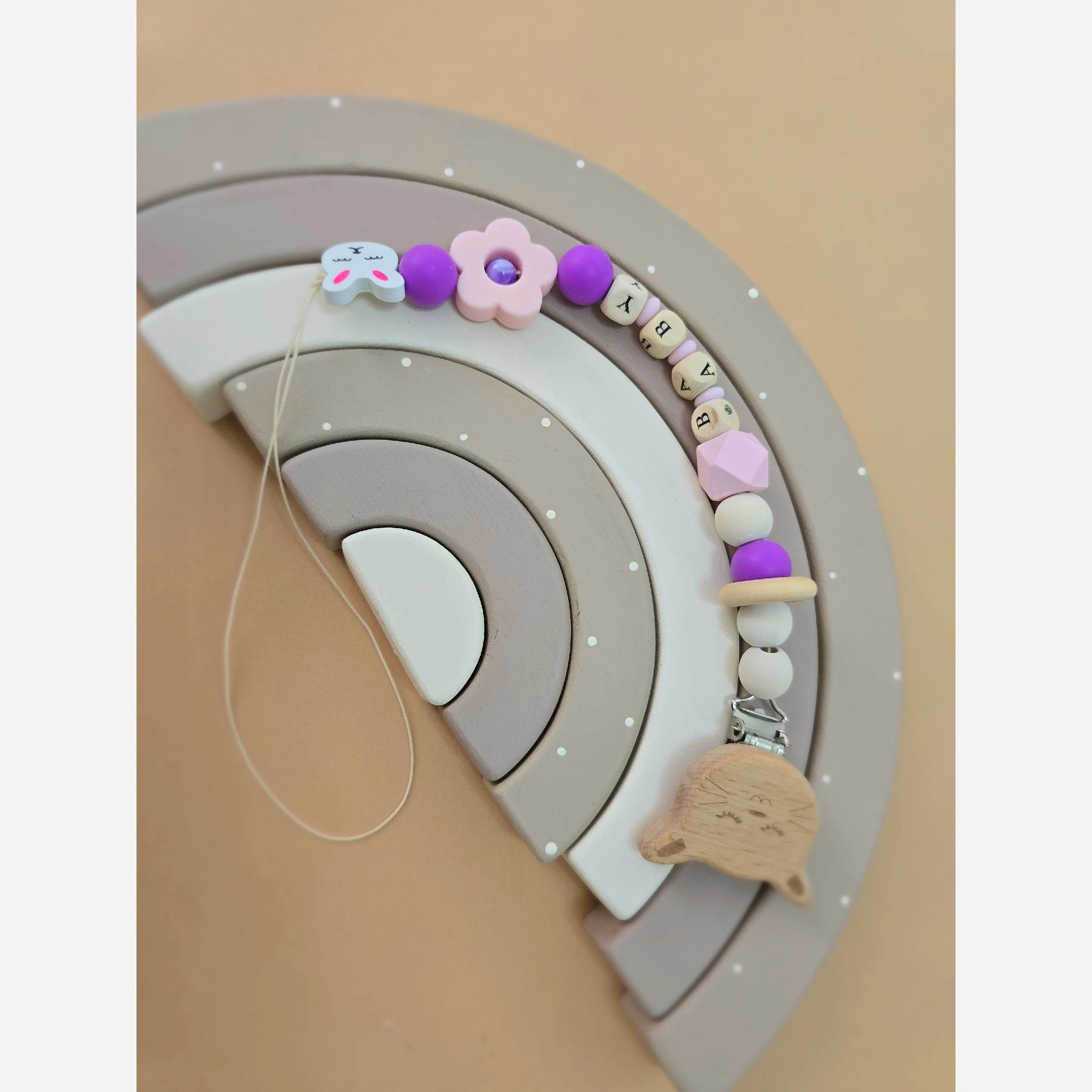 گیره پستونک رنگین کمانی چوبی و سیلیکونی نوزاد با مهره اسم دلخواه و عروسک خرگوشی | مناسب سیسمونی و هدیه کودک