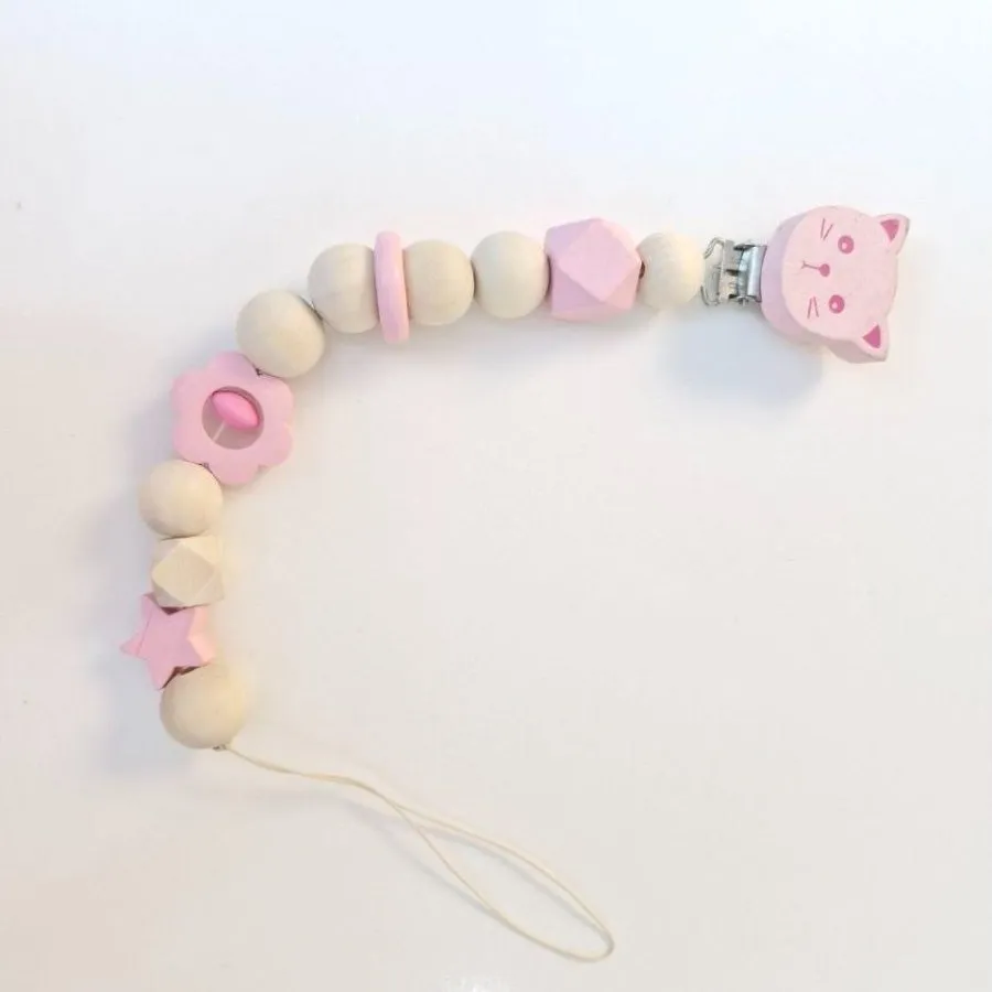 بند پستانک چوبی طرح گربه صورتی مهره سیلیکونی و چوبی نوزاد دخترانه