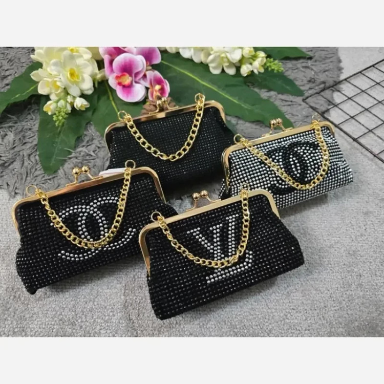 کیف مجلسی زنانه نگین کاری شده طرح گوچی و ال وی با زنجیر طلایی