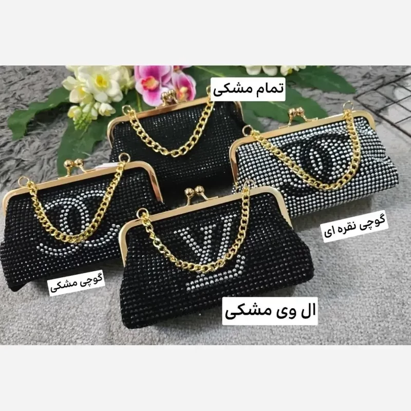 کیف مجلسی زنانه نگین کاری شده طرح گوچی و ال وی با زنجیر طلایی