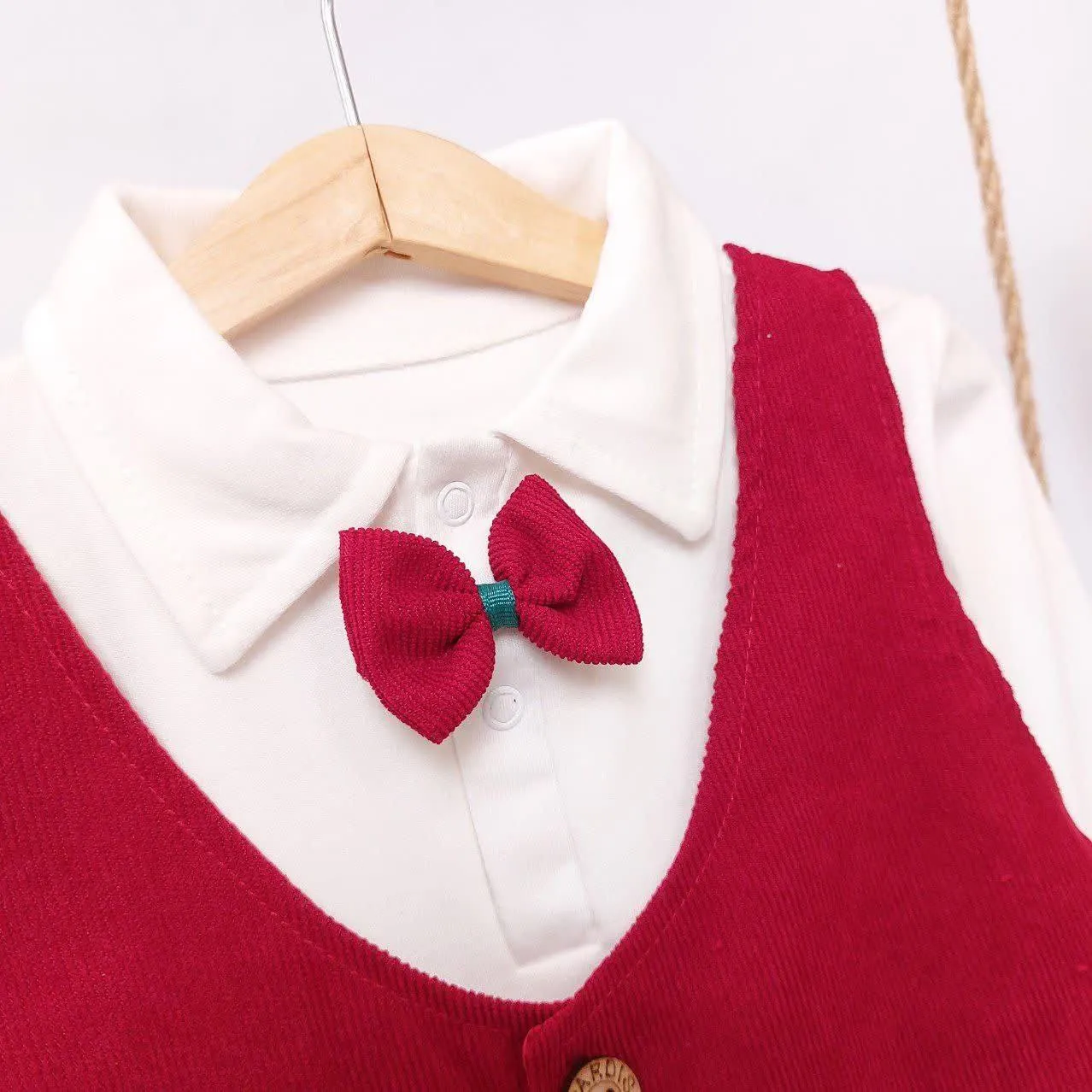ست لباس پسرانه یلدایی طرح جلیقه و پاپیون مخمل کبریتی قرمز | لباس نوزادی و کودک