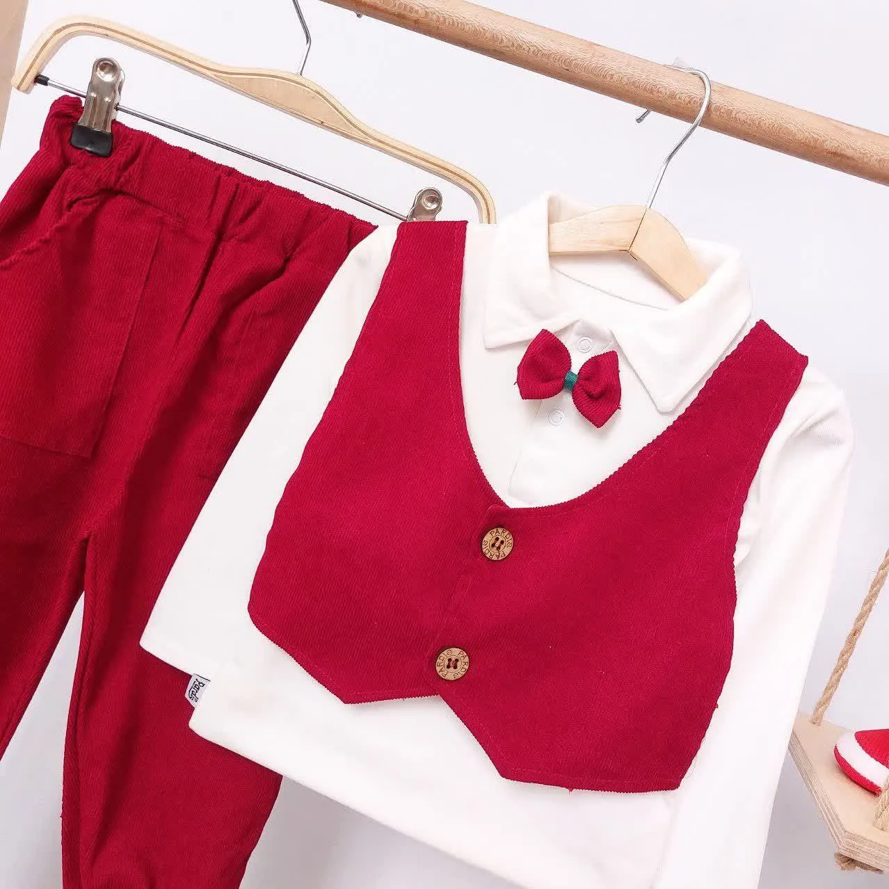 **ست لباس پسرانه یلدایی طرح جلیقه و پاپیون مخمل کبریتی قرمز**