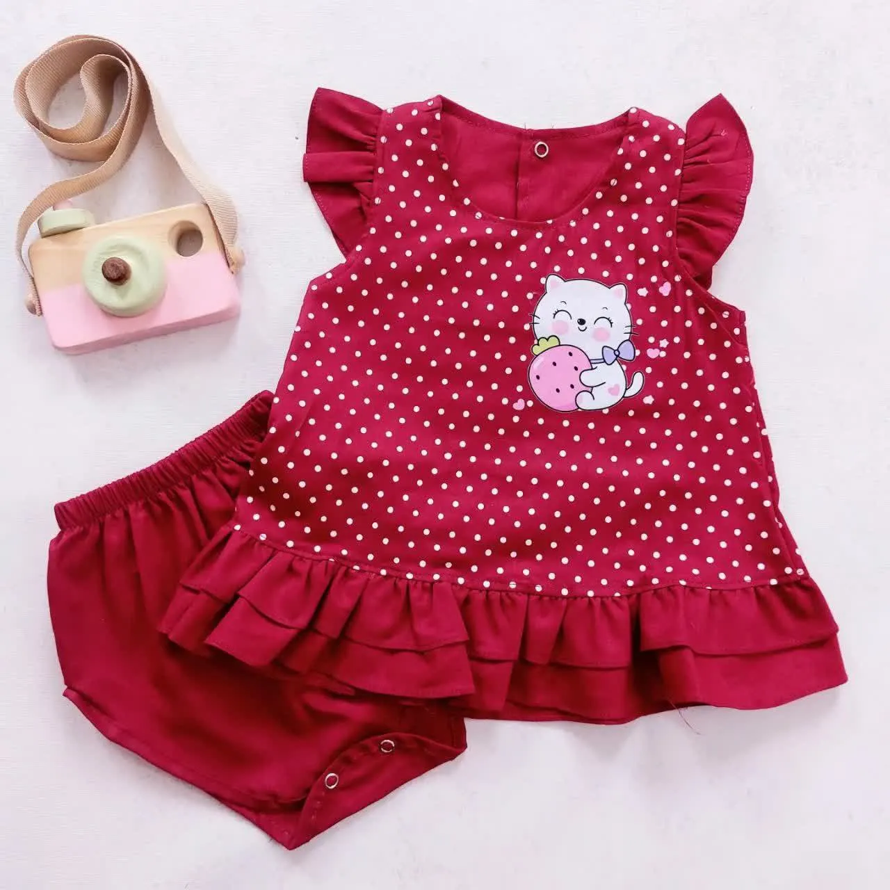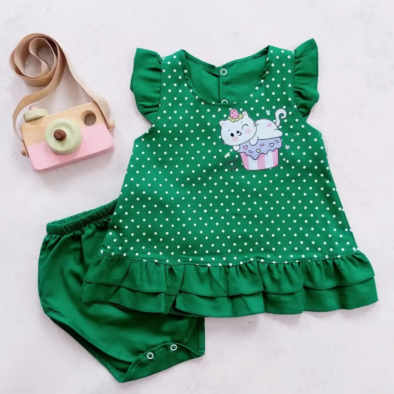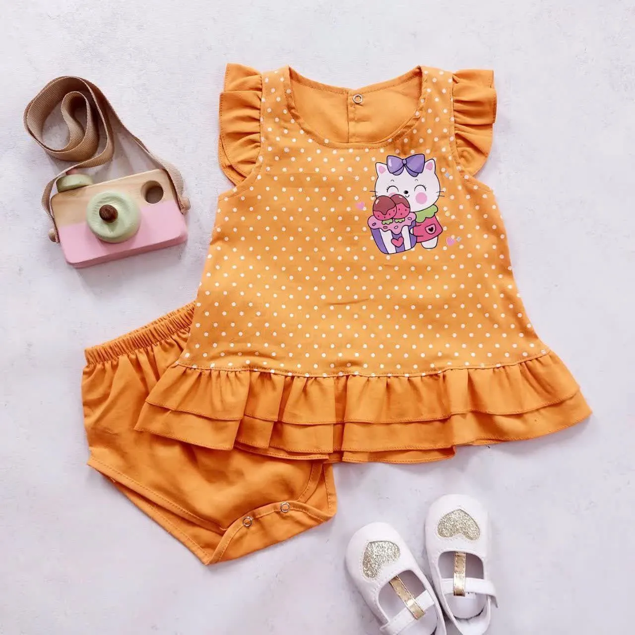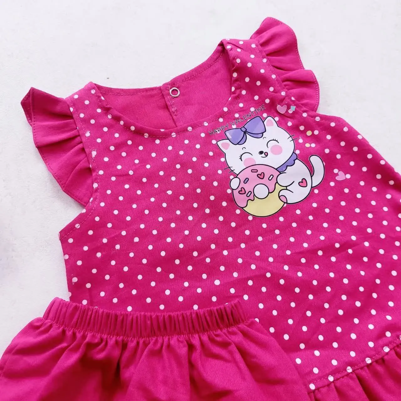 ست سارافون و شورت دخترانه طرح گربه خالدار نخی خنک