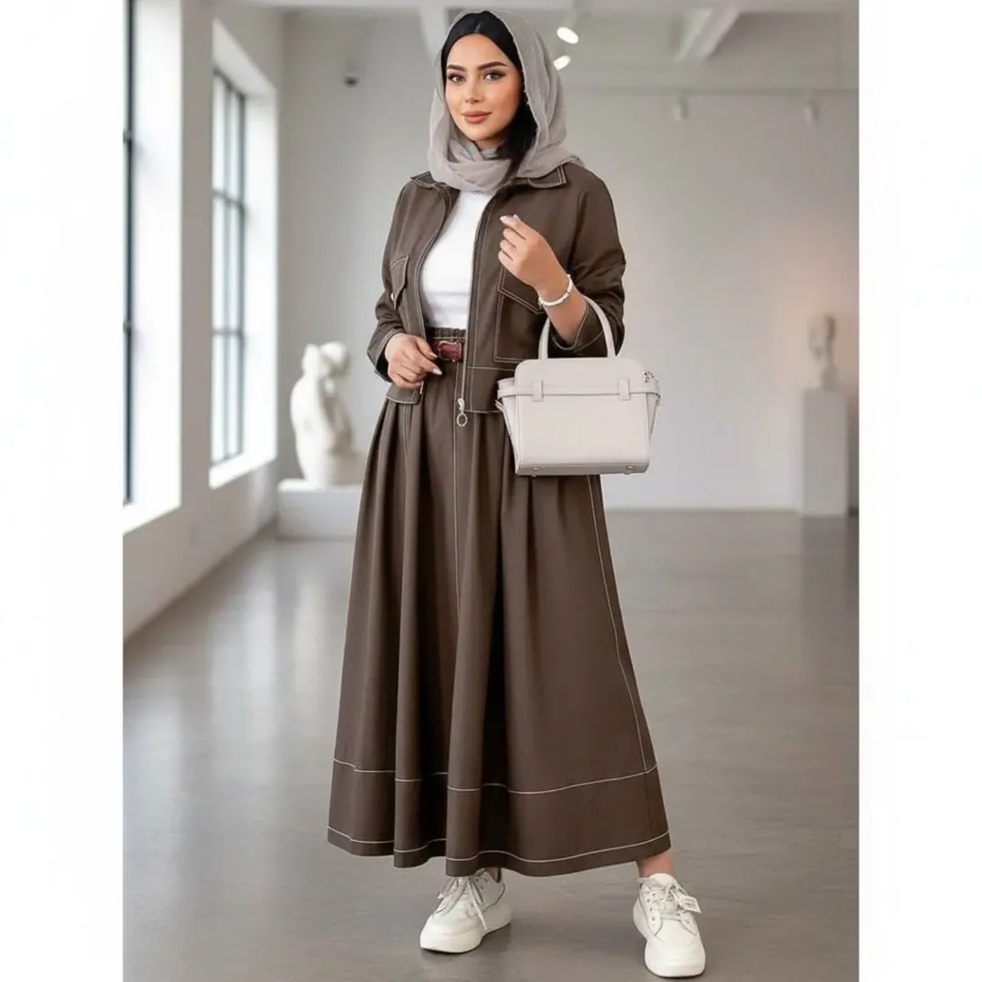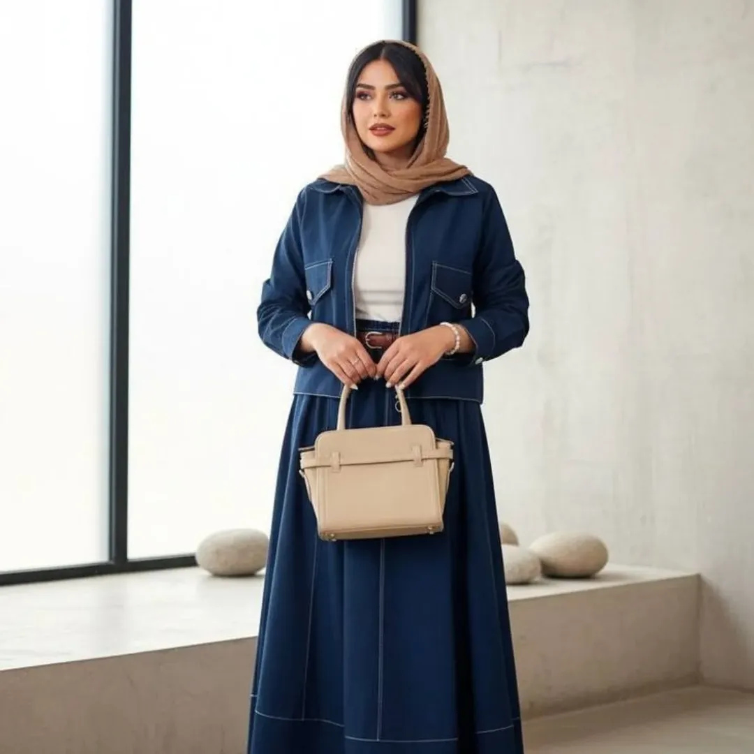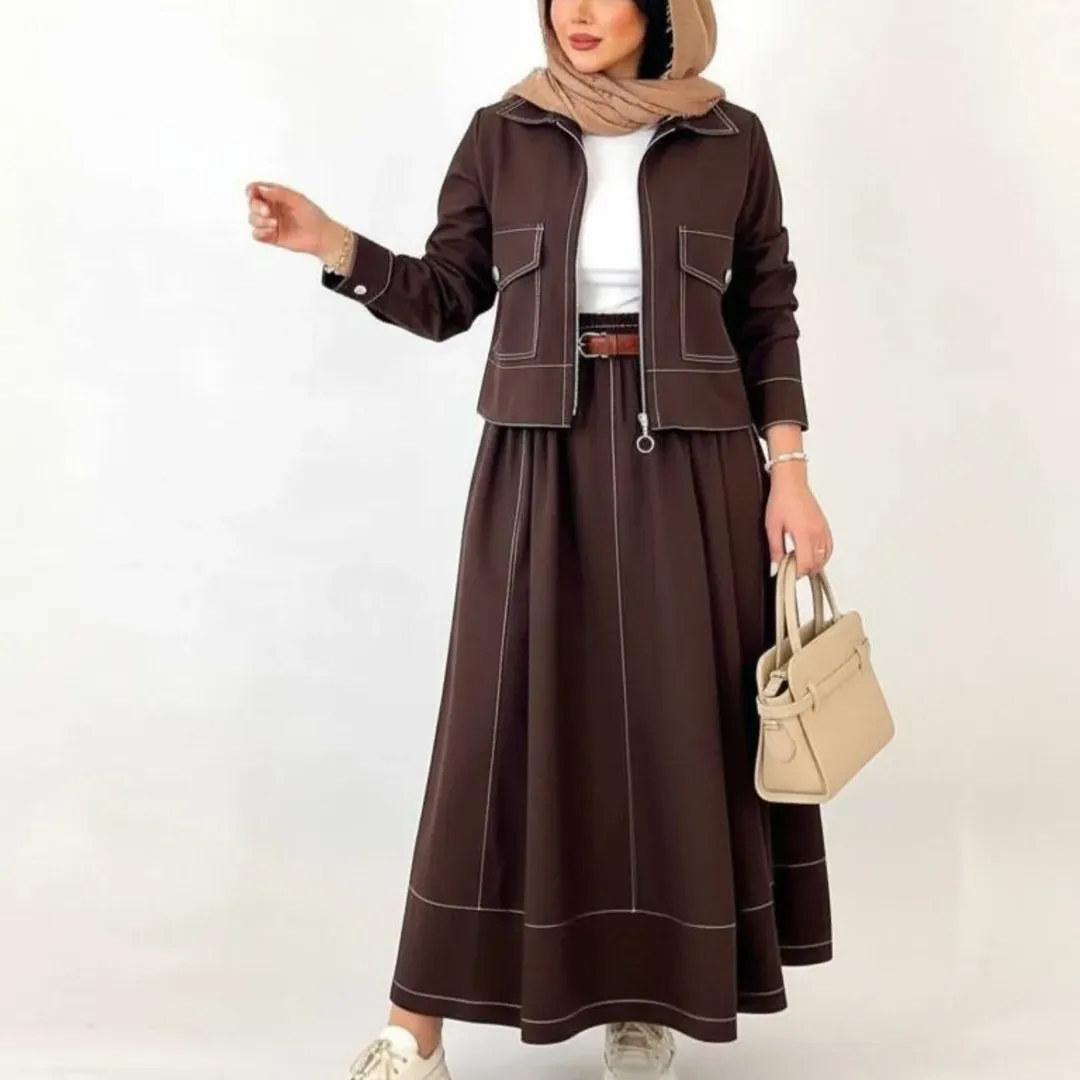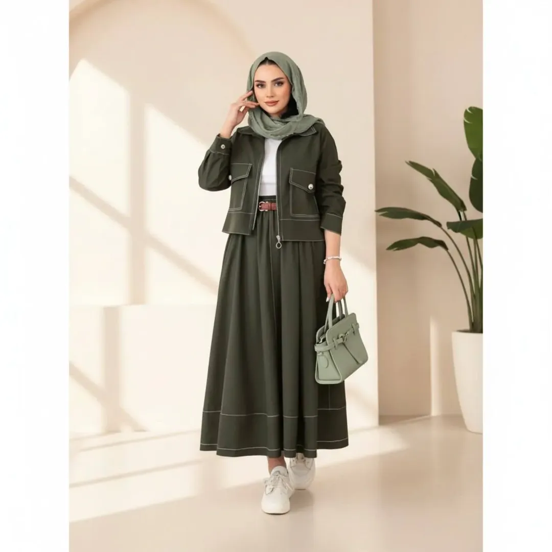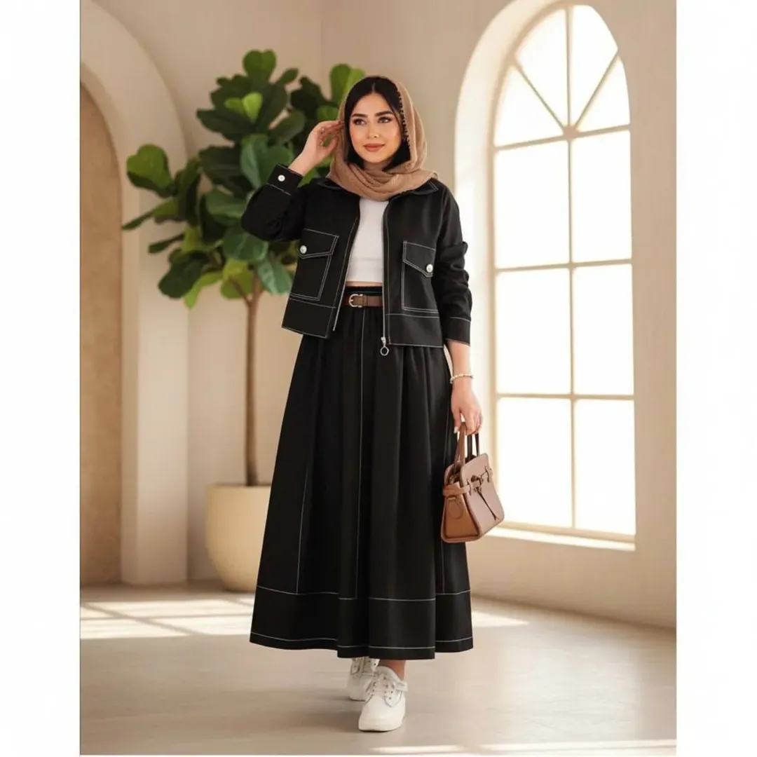 این ست دو تیکه شامل کت و دامن در پنج رنگ قهوه ای، سرمه ای، مشکی، سبز و نسکافه ای میباشد. قد کت حدود ۵۷ سانتیمتر و قد دامن حدود ۹۵ سانتیمتر است. پیش کار لای پرشین خورده برای ایستای بهتر و شامل کمربند نیز میباشد.