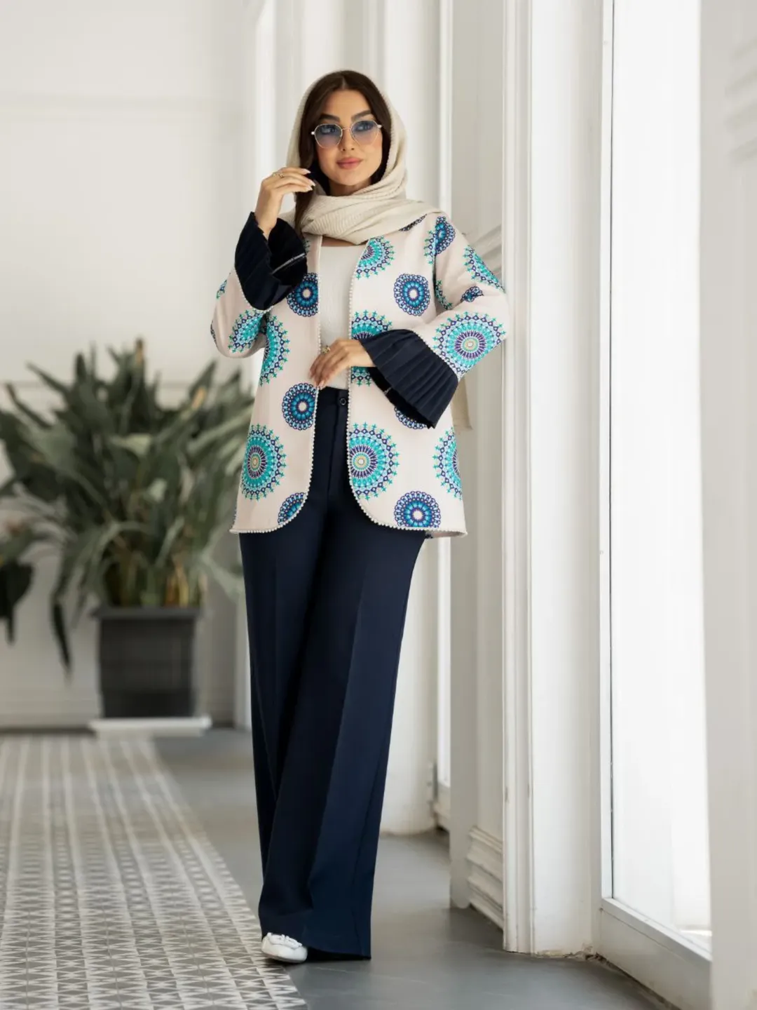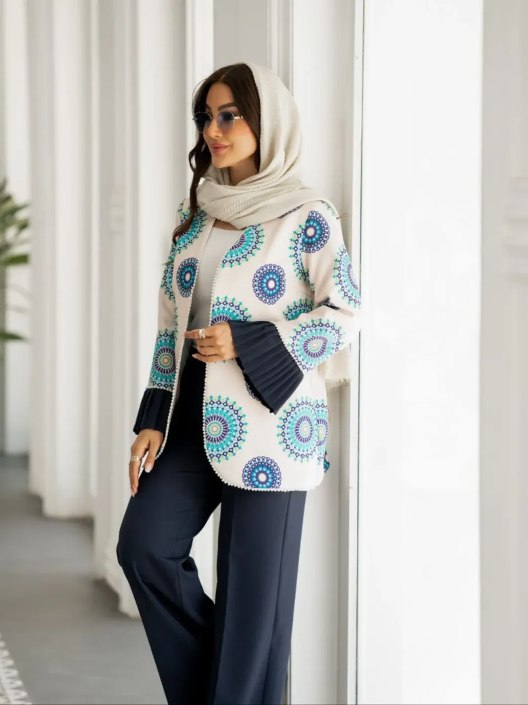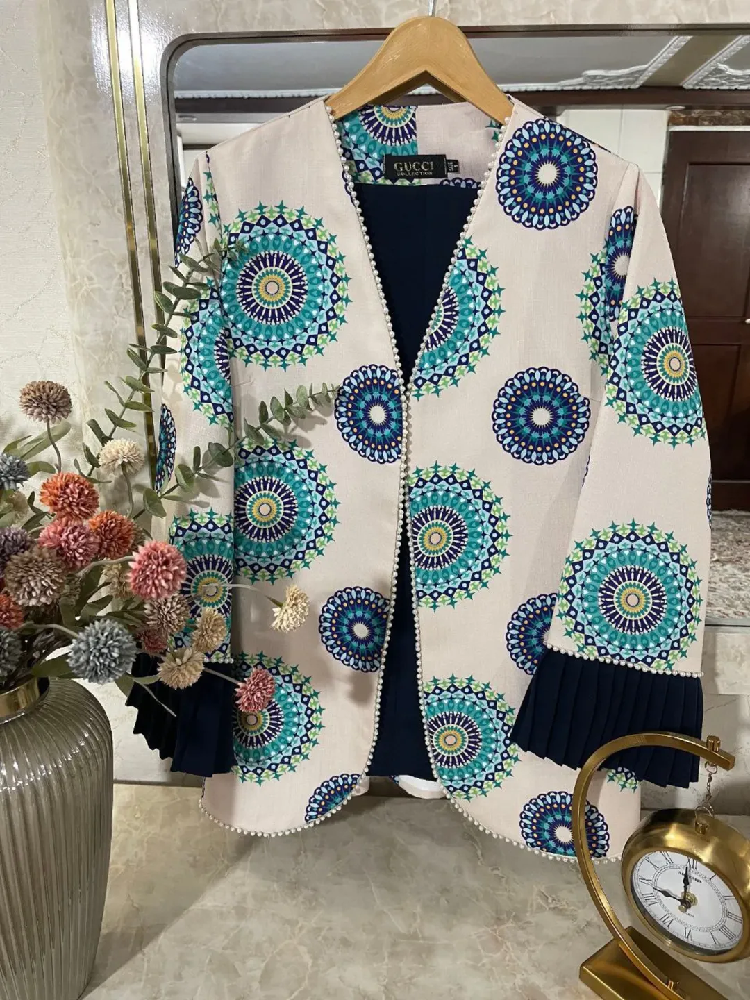 کت شلوار خوشگل و خانمانه با پارچه کرپ مازراتی. قسمت پیش کت جهت ایستایی بهتر لایی پرشین دارد. جلو کت نوار مرواریدی اعلا، کمر شلوار قسمت پشت کش دارد. قسمت جلو زیپ و دکمه.