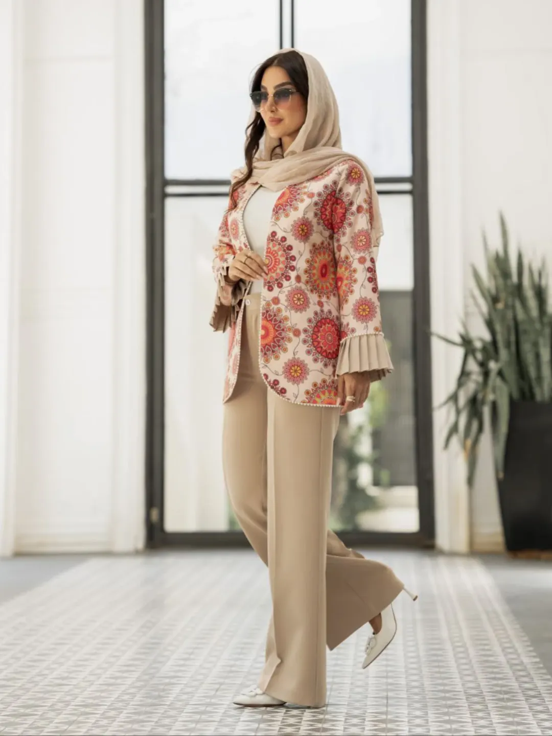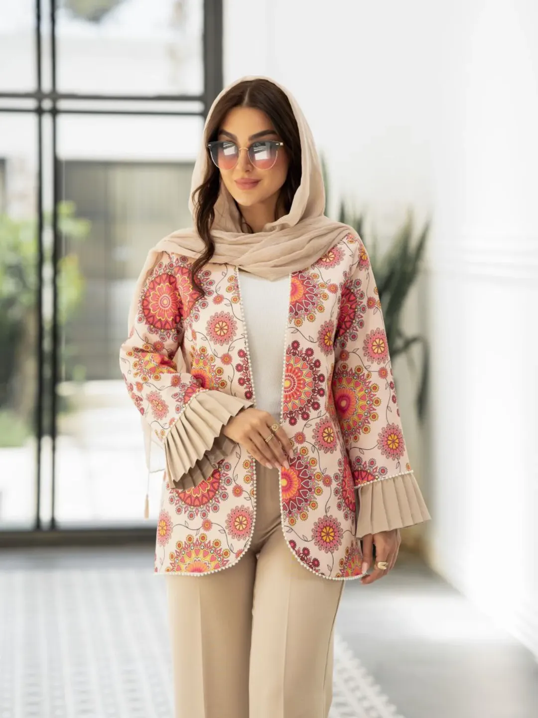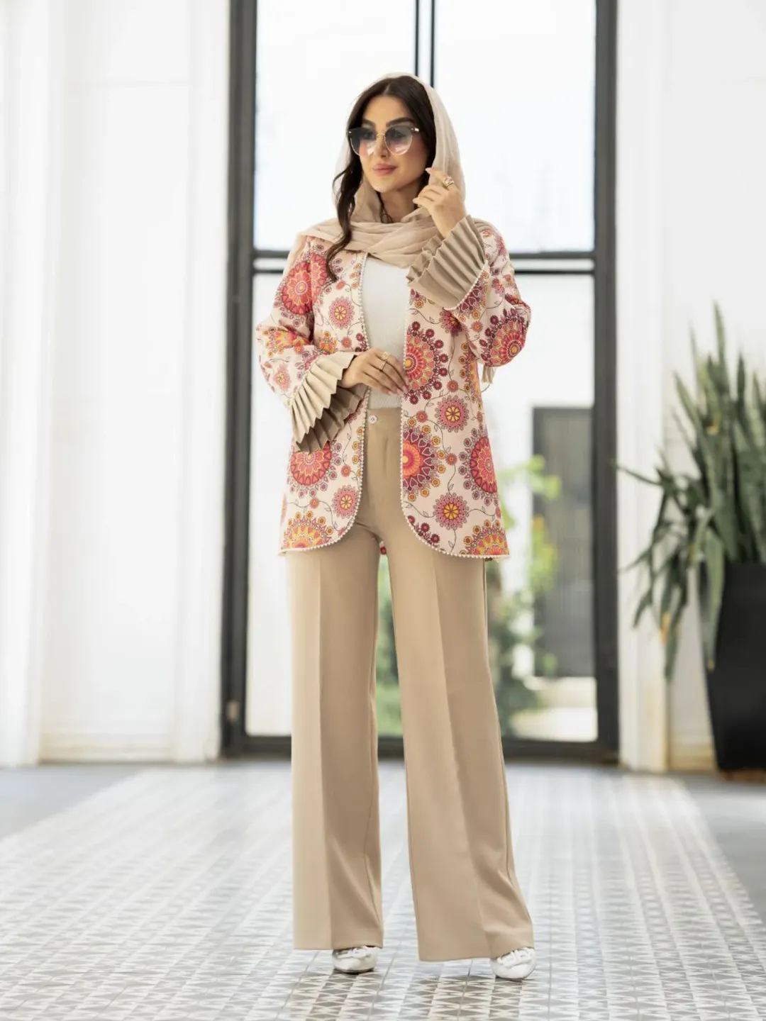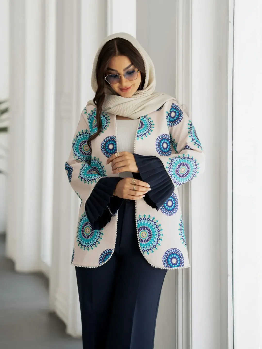 کت شلوار خوشگل و خانمانه با پارچه کرپ مازراتی. قسمت پیش کت جهت ایستایی بهتر لایی پرشین دارد. جلو کت نوار مرواریدی اعلا، کمر شلوار قسمت پشت کش دارد. قسمت جلو زیپ و دکمه.