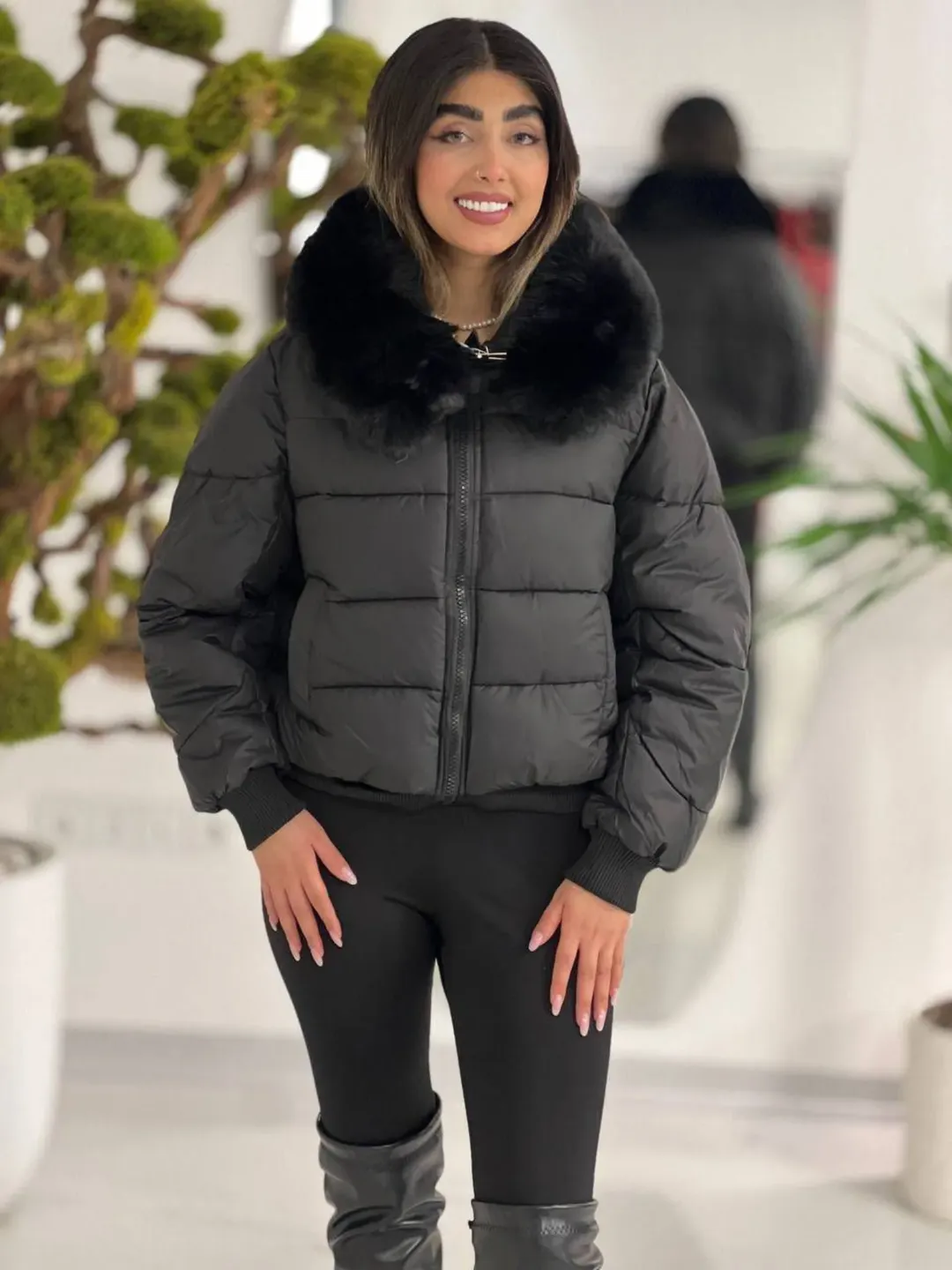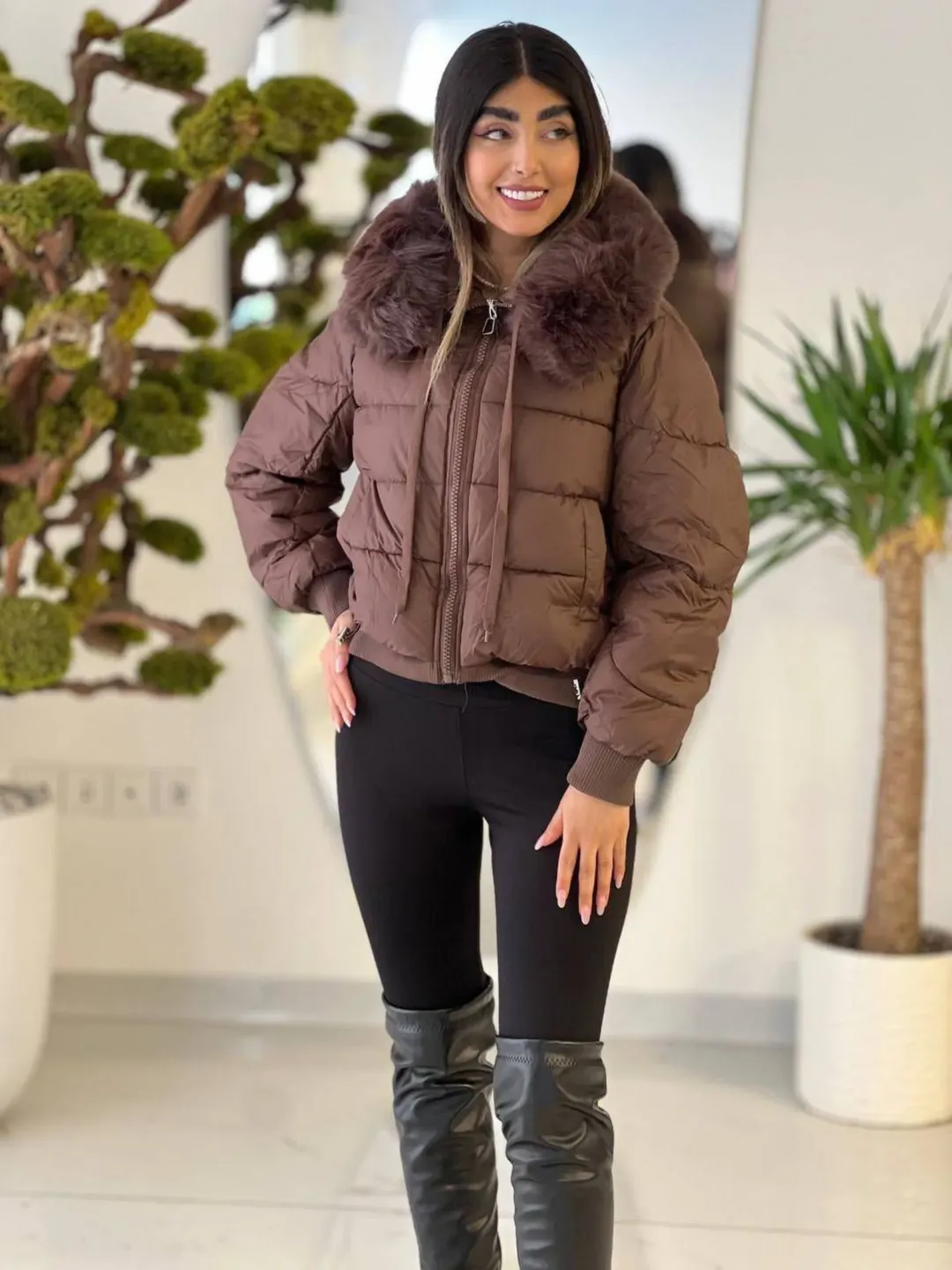 کاپشن نیم تنه با خز و يقه جدا شونده، مناسب برای سایزهای ۳۶ تا ۴۰ و ۴۲ تا ۴۶. دو رنگ شیک.