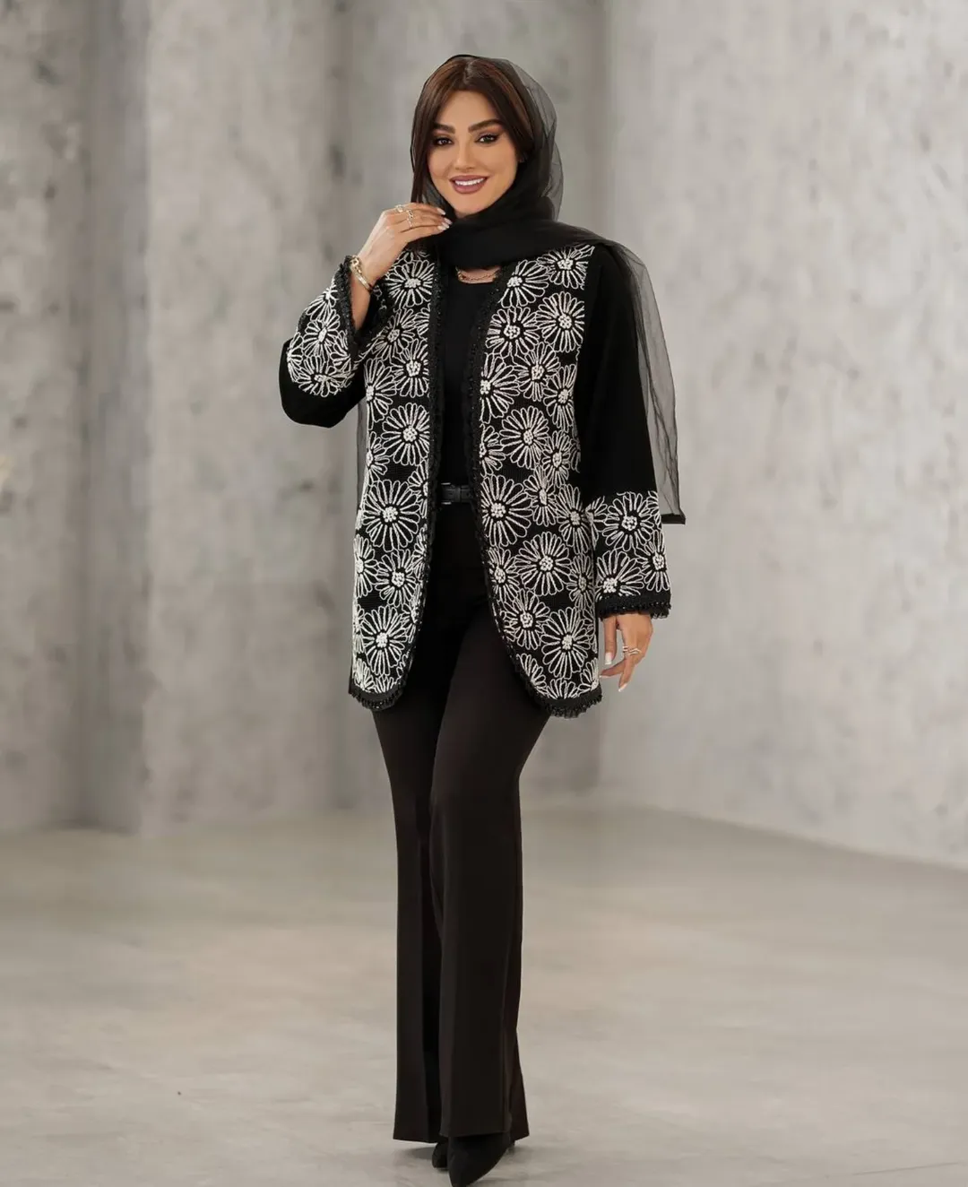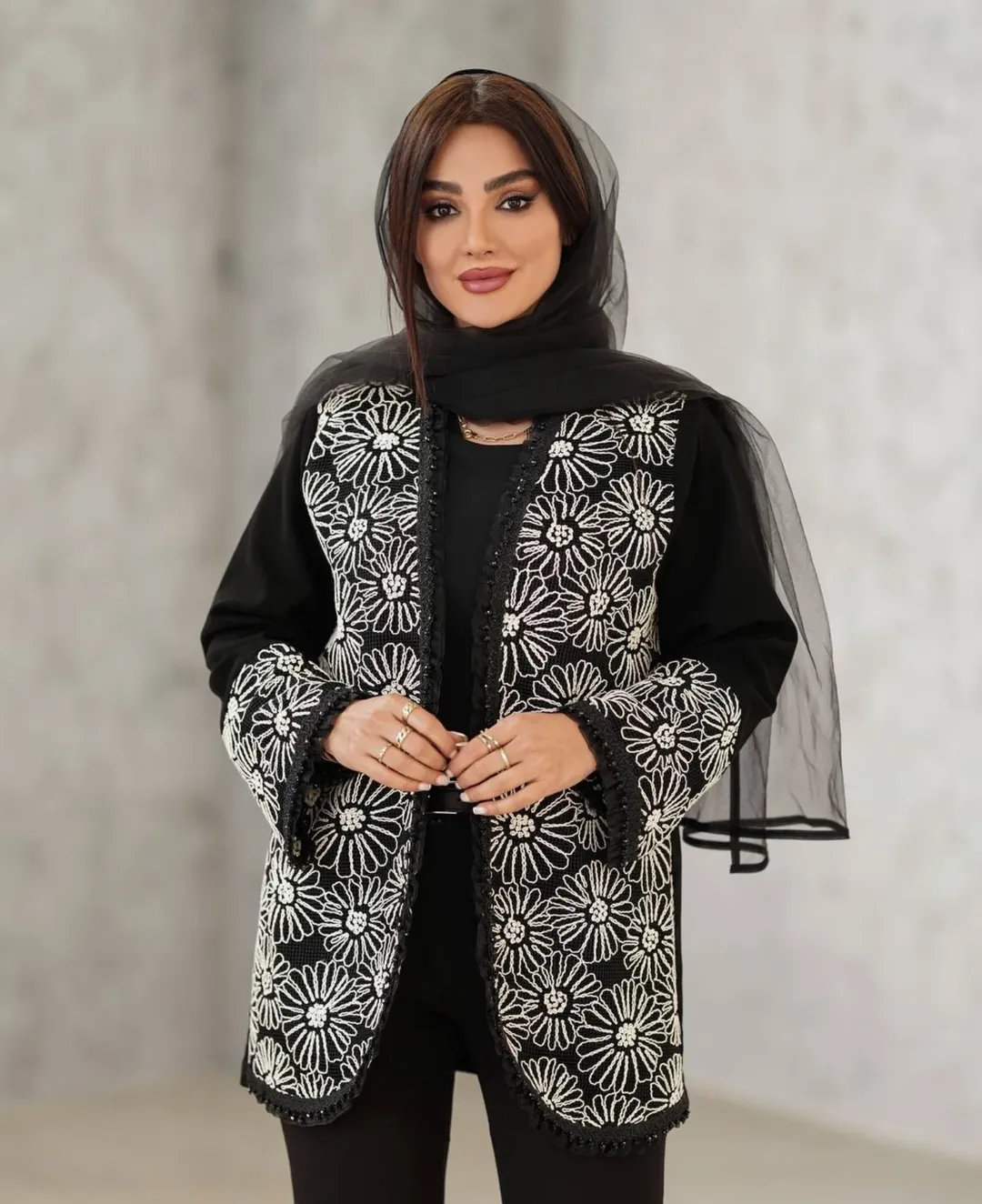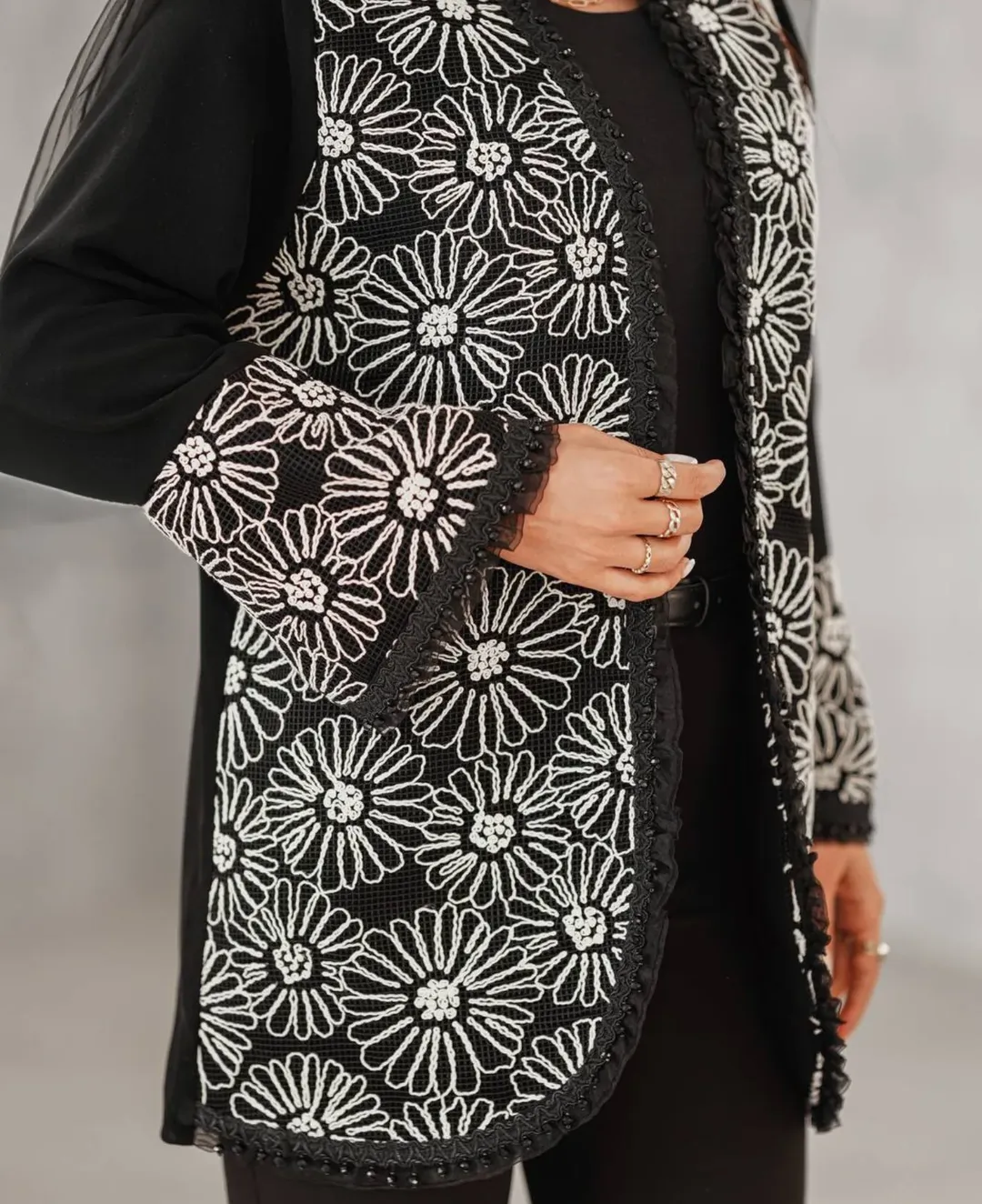 وقتی سادگی و ظرافت در کنار هم میدرخشند. کالکشن بهار با جنس پارچه کرپ لمه جت بلک، خرجکار دانتل و جلو کار لایی پرشین.