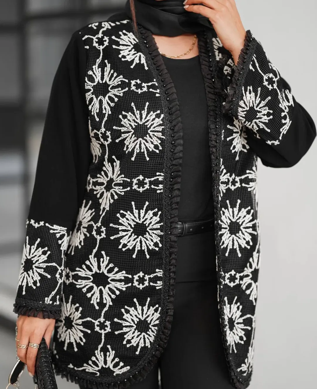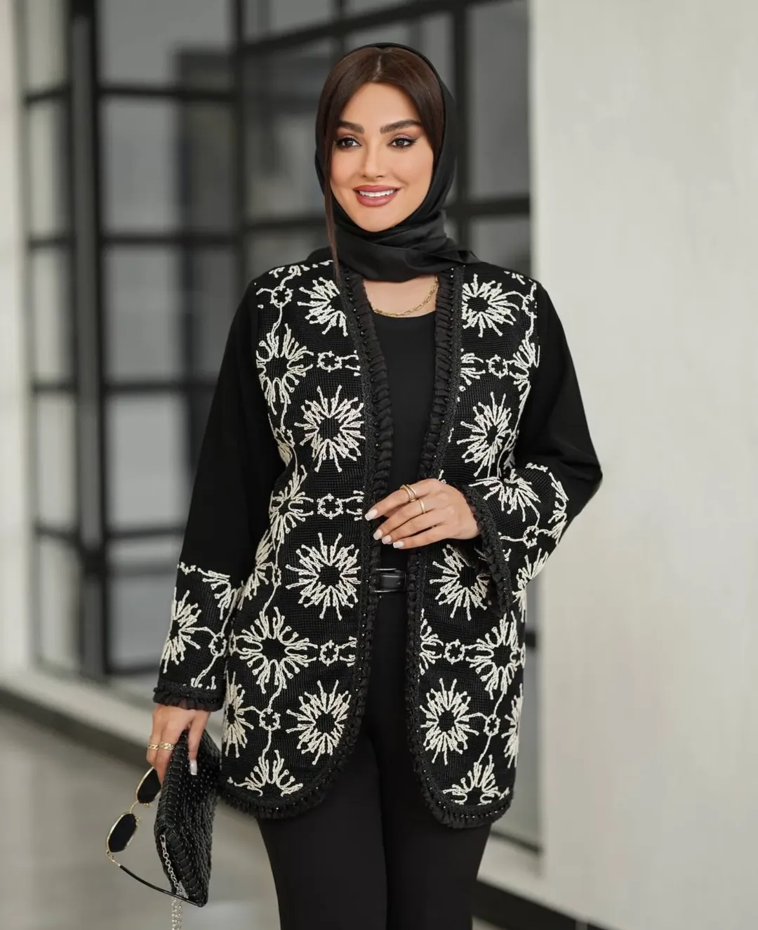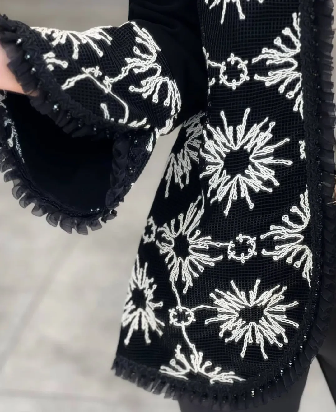 وقتی سادگی و ظرافت در کنار هم میدرخشند. کالکشن بهار با جنس پارچه کرپ لمه جت بلک، خرجکار دانتل و جلو کار لایی پرشین.