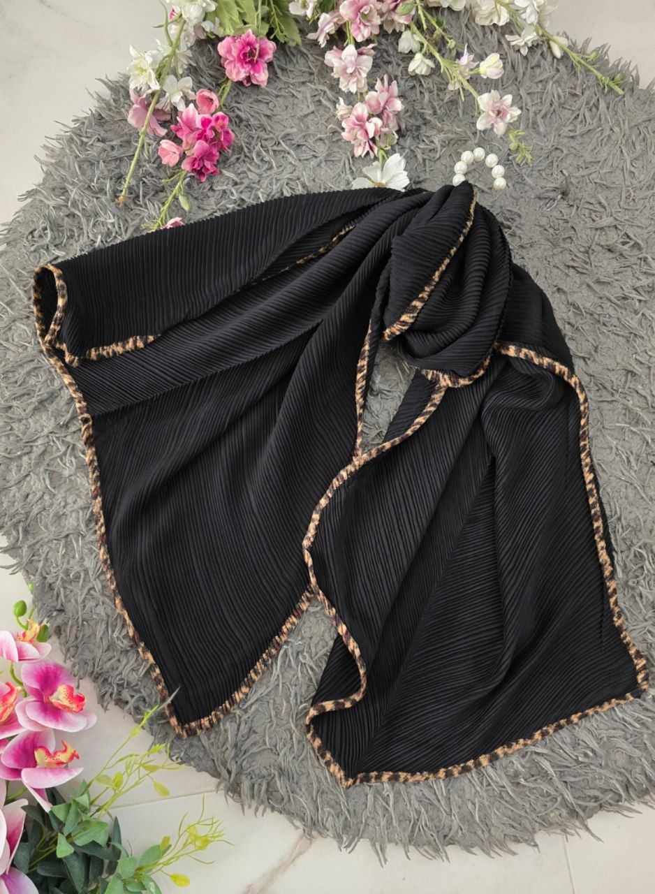 شال حاشیه پلنگی مشکی با جنس پلیسه ریز باکیفیت، خوشفرم و مناسب استایلهای شیک و مجلسی