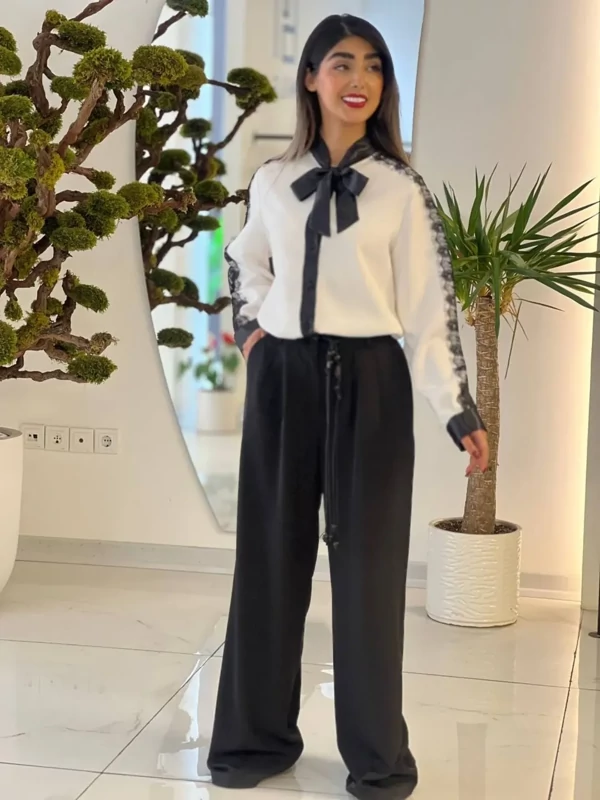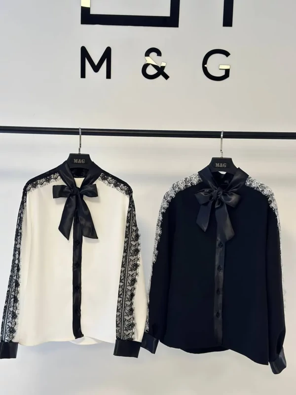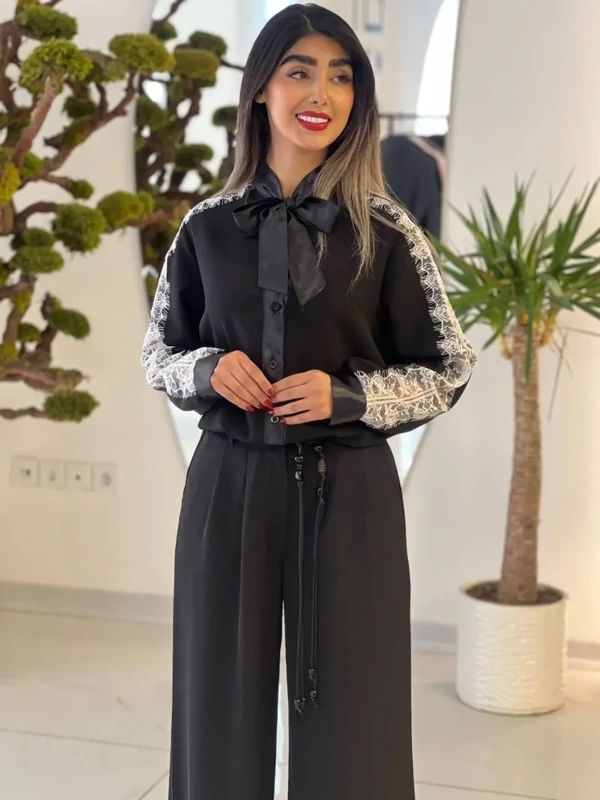 شومیز ژینا پارچه مازراتی ترکیب با ساتن و تور طرحدار سایز 1 و 2