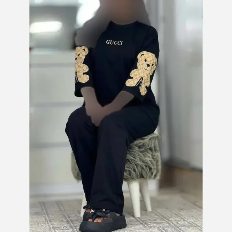 ست بلوز و شلوار نخی زنانه طرح خرس گلدوزی شده مدل بیکران فری سایز مشکی