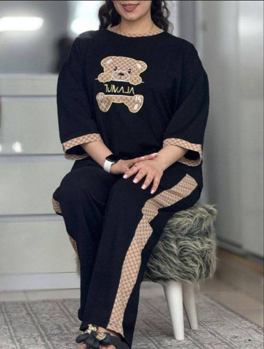 ست تی شرت و شلوار نخ پنبه زنانه طرح دار قواره دار سایز فری