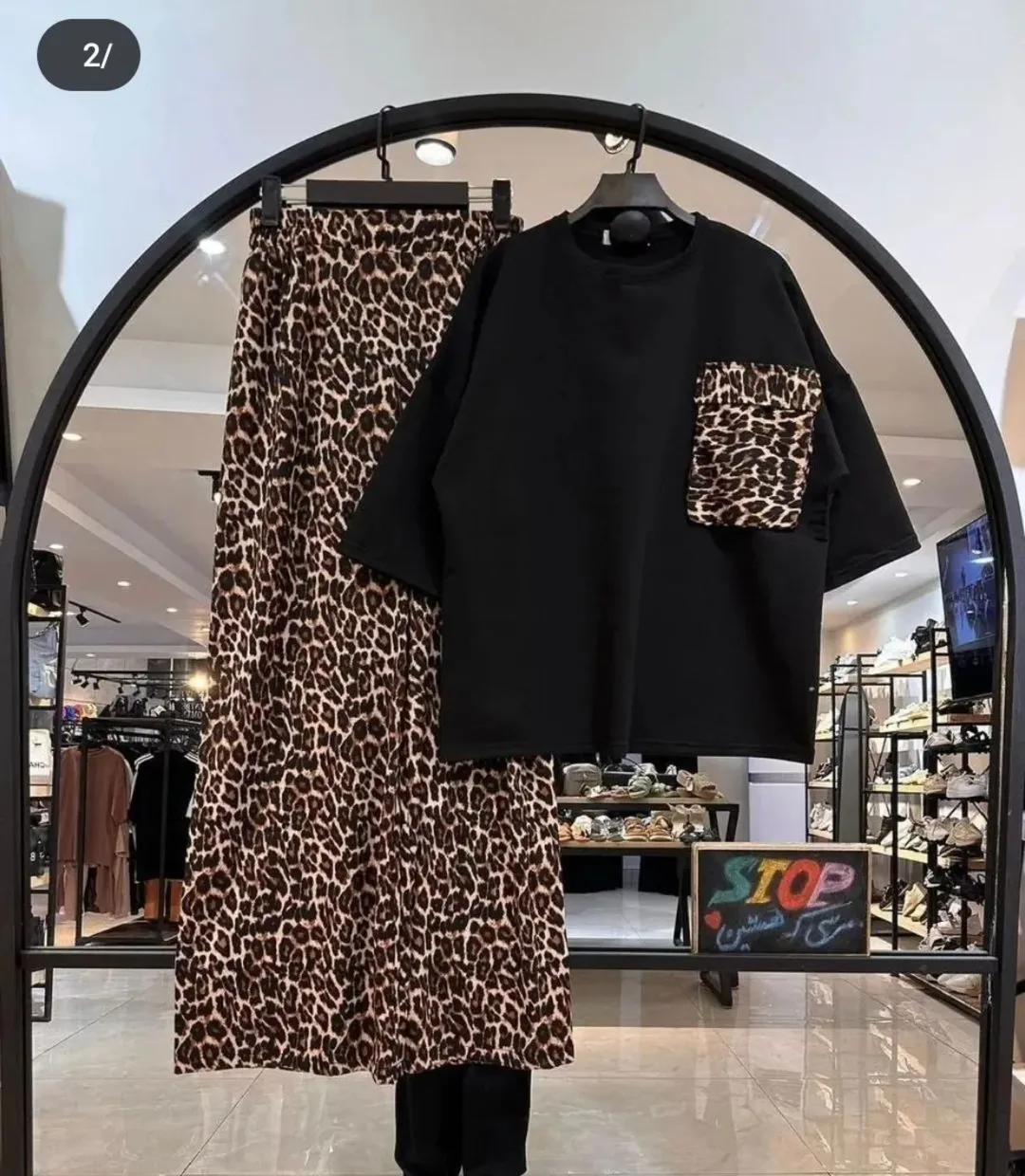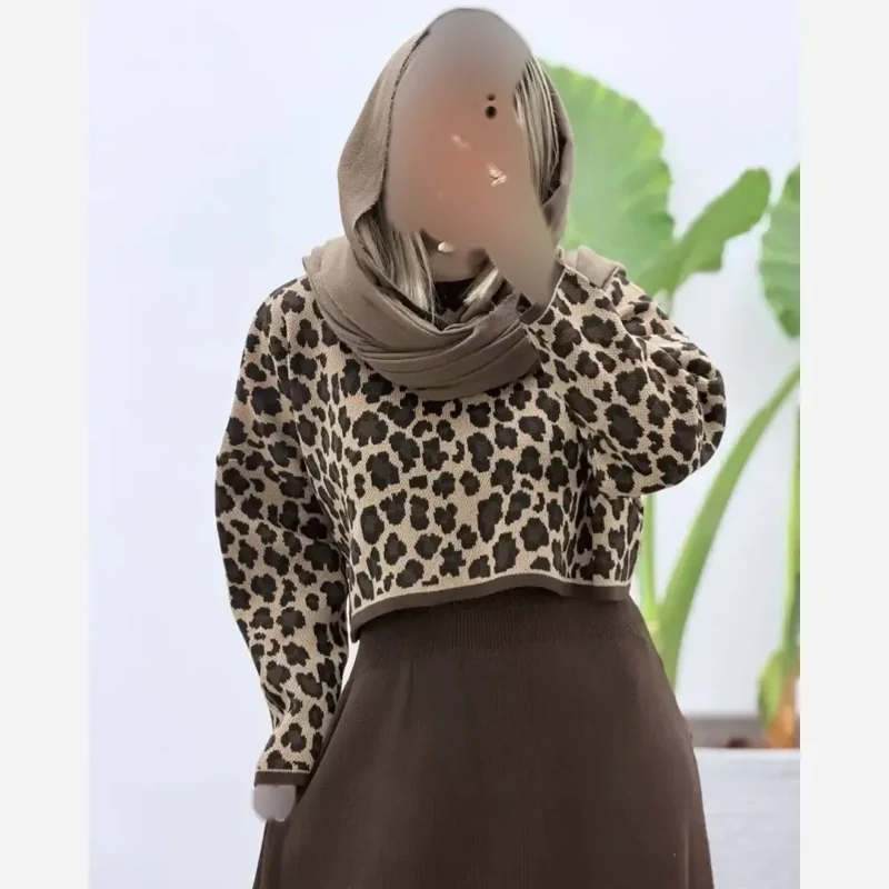 ست بافت دو تکه زنانه طرح پلنگی و سارافون یقه گرد فری سایز