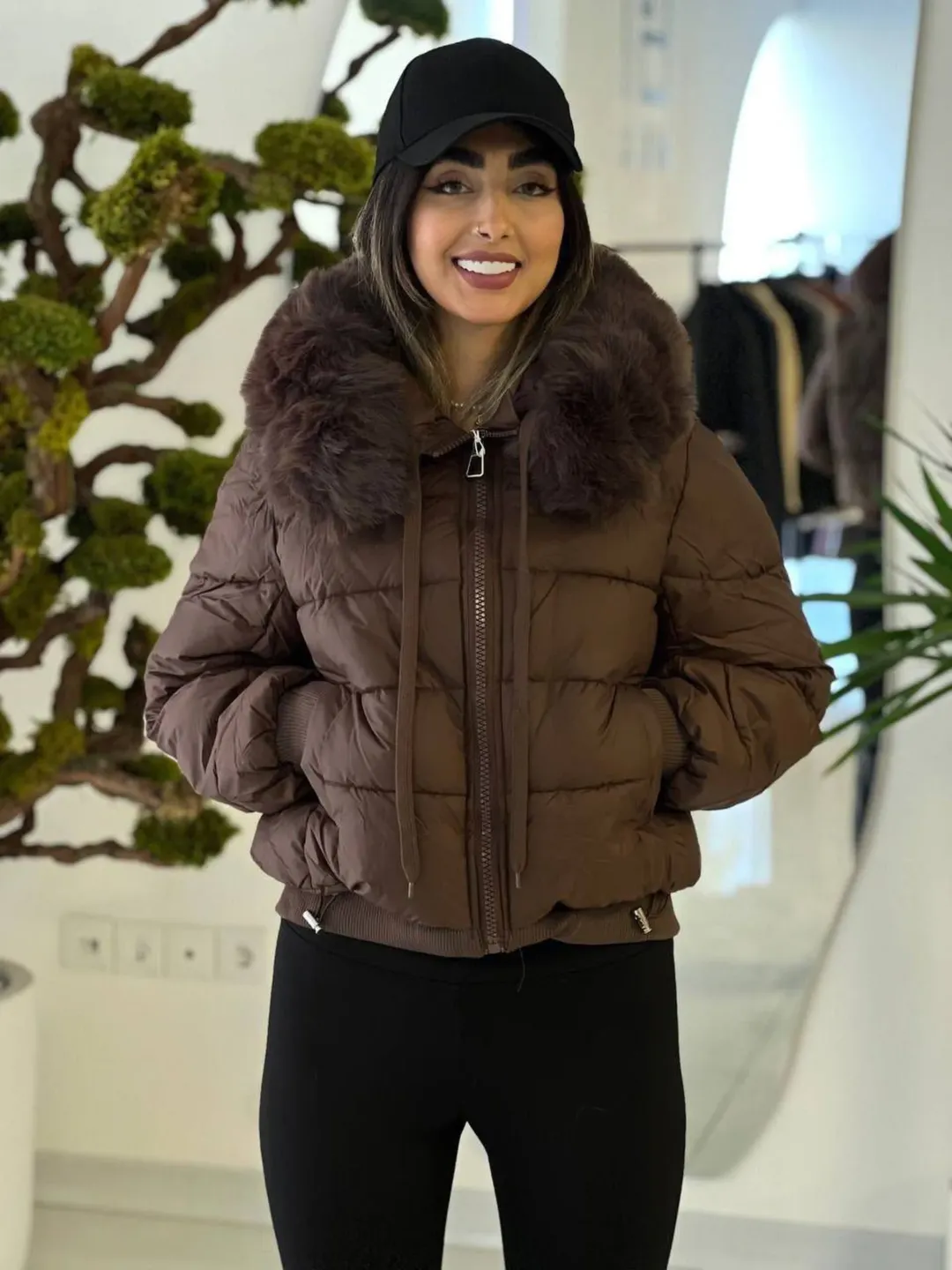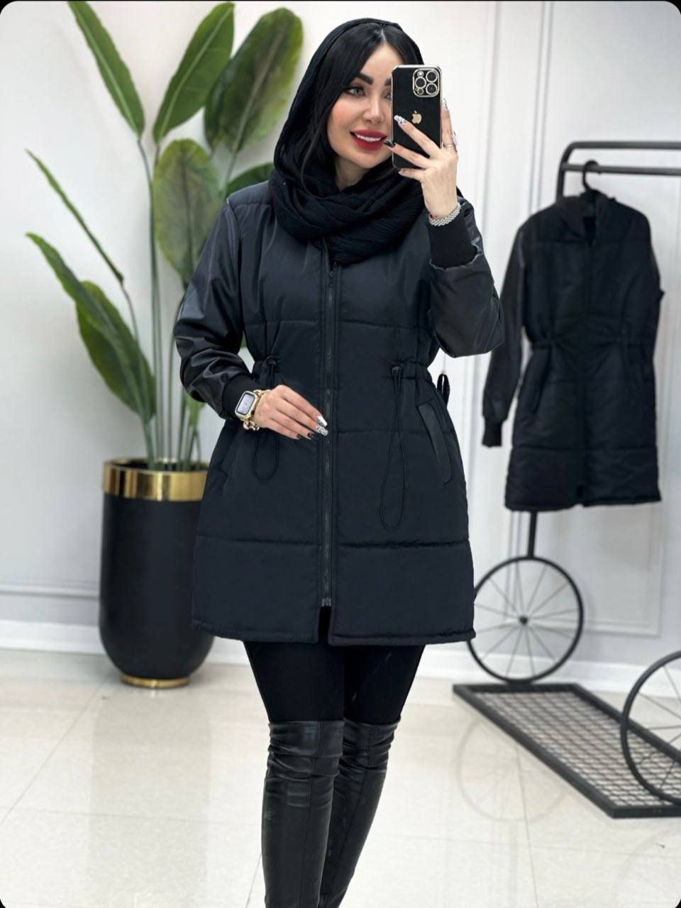 کاپشن زنانه نیکا با جنس مموری و آستر پشم شیشه گرم. قد ۹۰، دورسینه ۱۰۶، با کلاه و کمرگت. خرید فوری و ارسال رایگان.