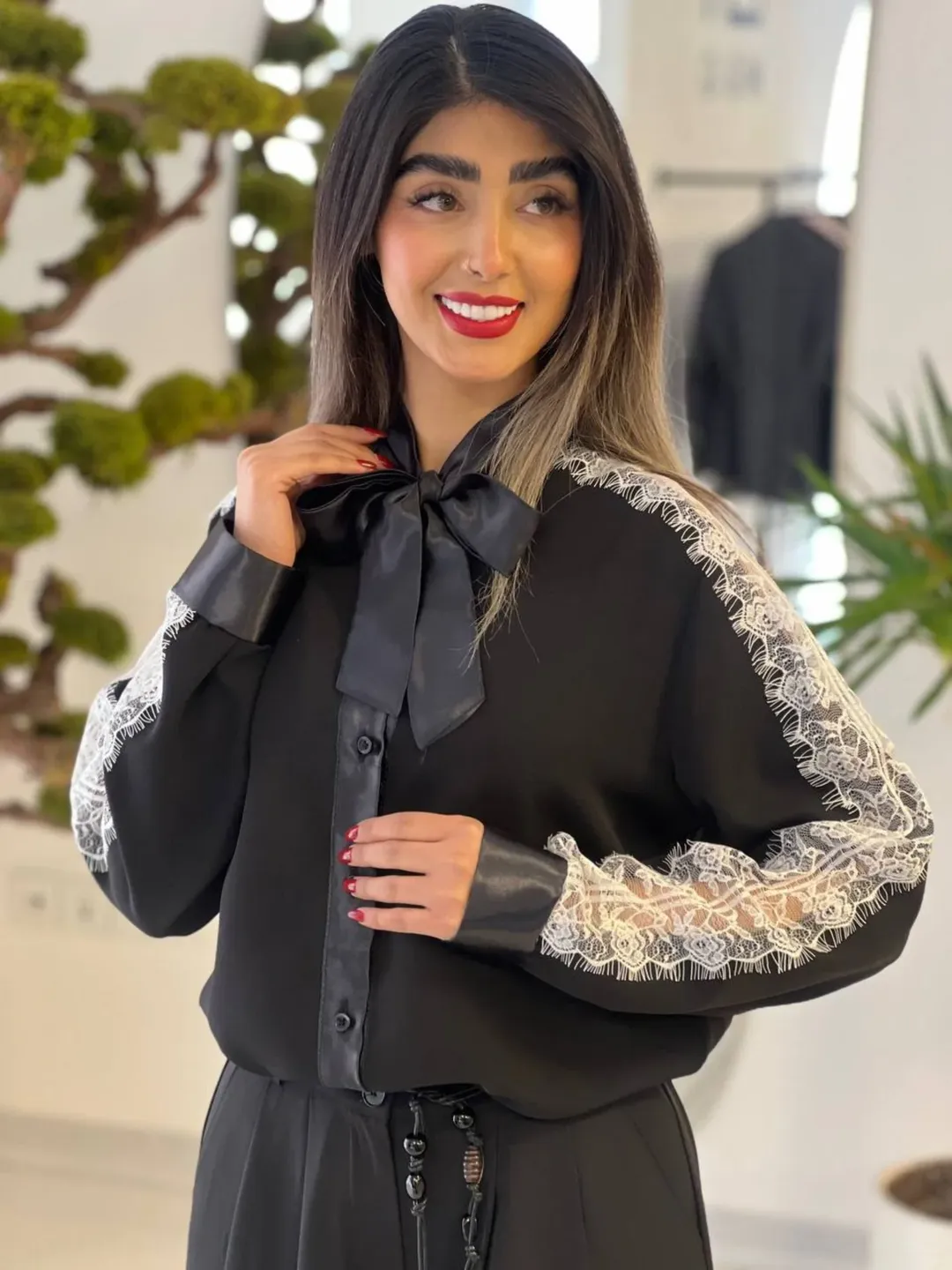 شومیز ژینا پارچه مازراتی ترکیب با ساتن و تور طرحدار سایز ۱ و ۲