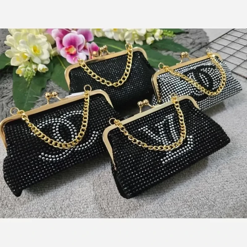 کیف مجلسی زنانه نگین کاری شده طرح گوچی و ال وی با زنجیر طلایی